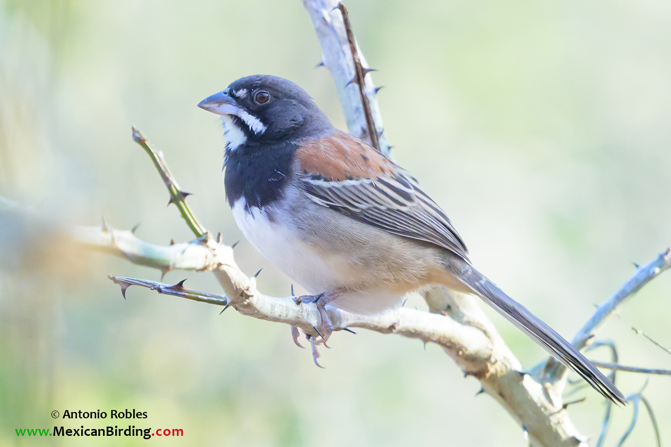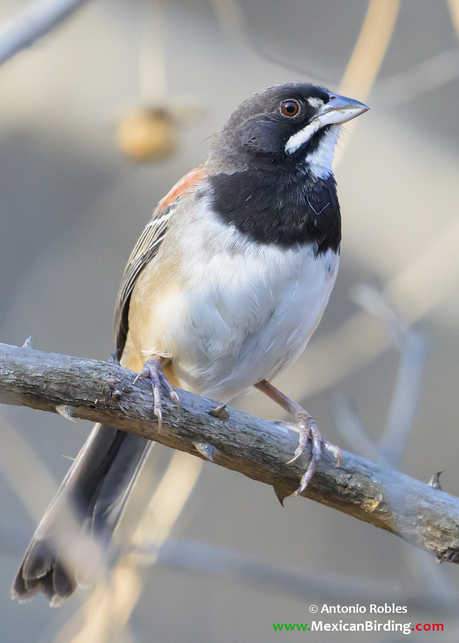 Birds Of Mexico Cerro La Cumbre, Colima, México / Feb-2024 Black-chested Sparrow Zacatonero Pecho Negro (Peucaea humeralis) Endemic to Mexico ID:→ Dark gray head and black chest band.→ White moustache and throat.Similar Species: Stripe-headed Sparrow.Antonio RoblesPublished: Jun 03, 2022Updated: Oct 07, 2025 Cerro La Cumbre, Colima, México / Feb-2024 Grutas de San Gabriel, Ixtlahuacán, Colima, México / Jul-2017